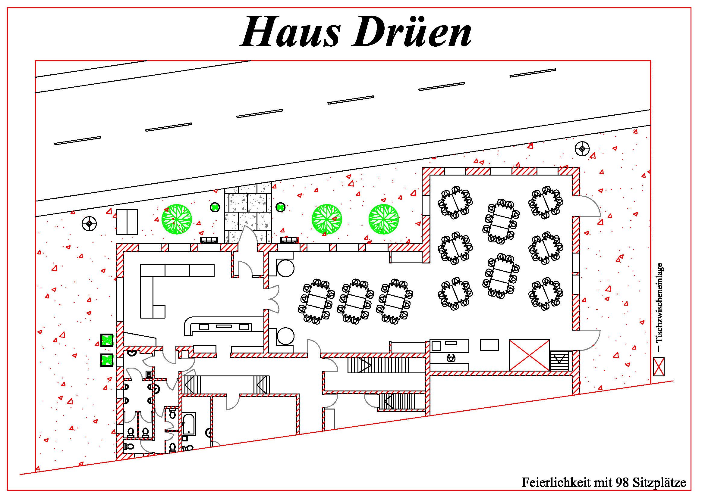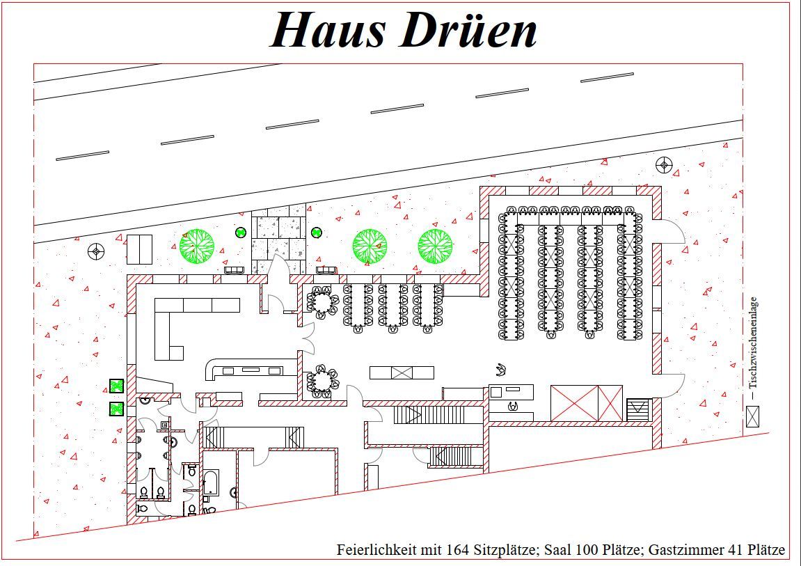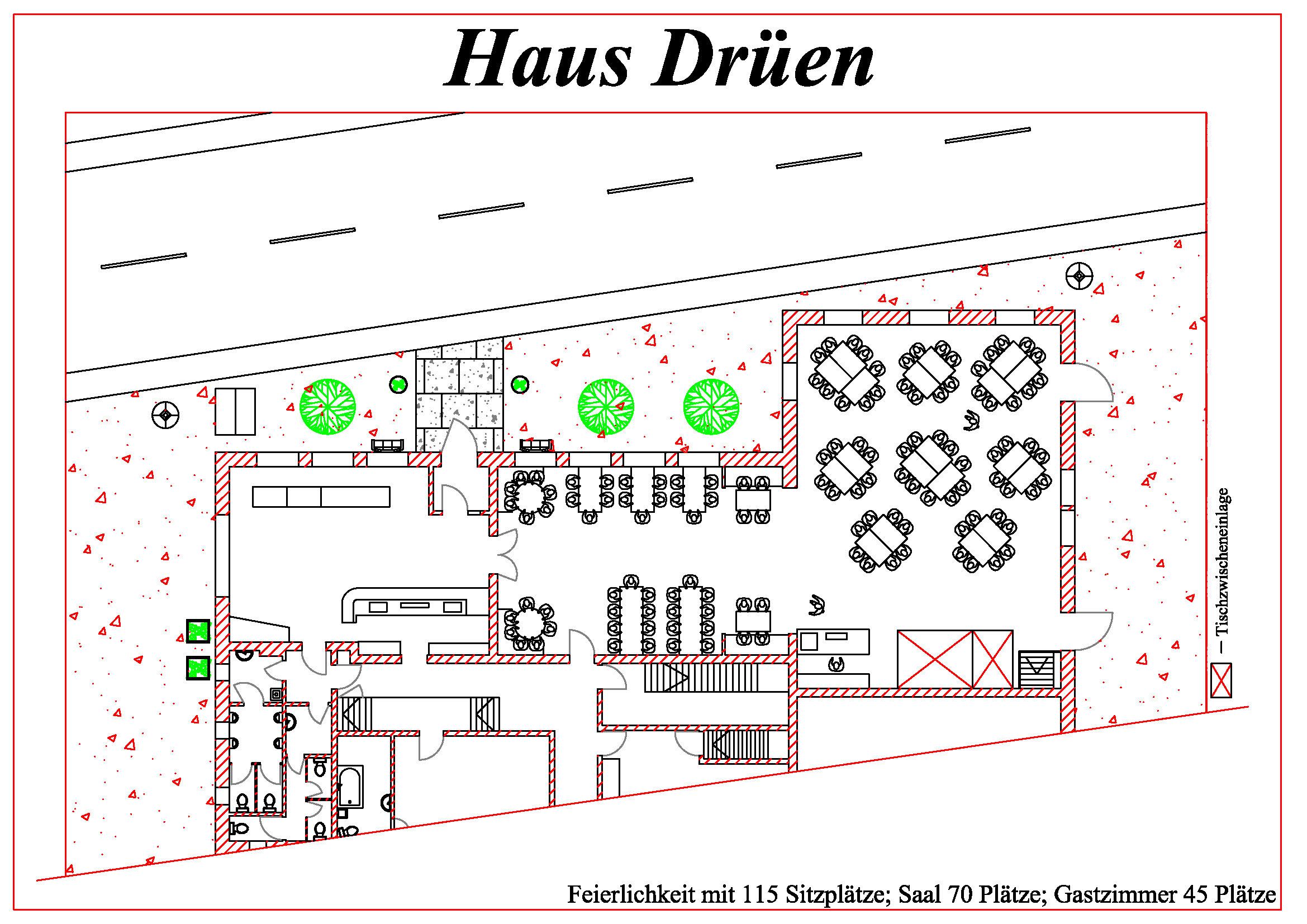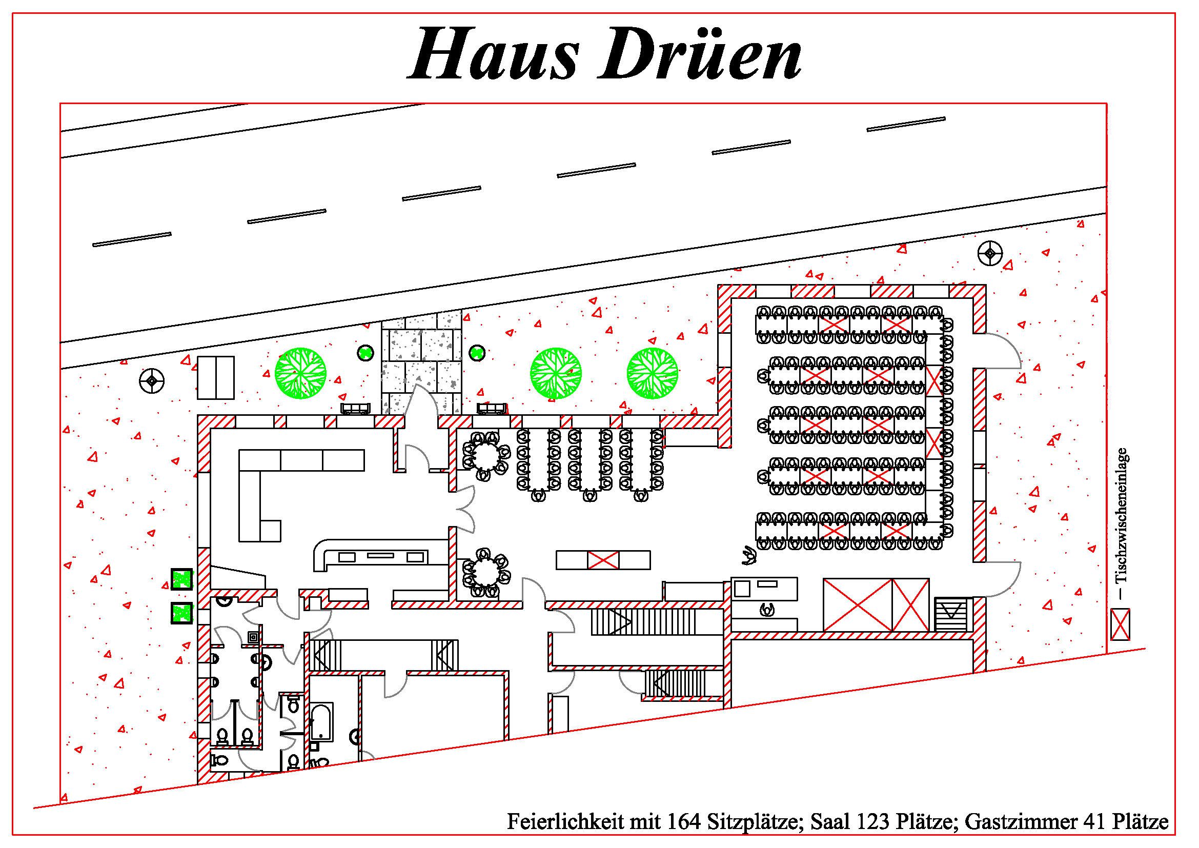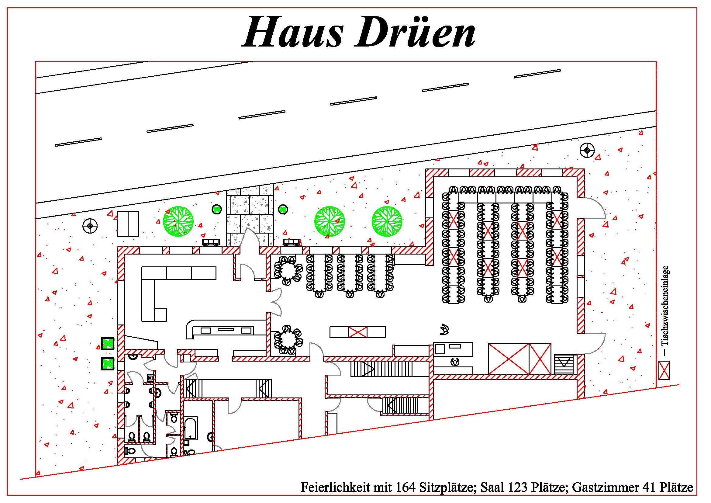 Das Haus Drüen verfügt über einen Schankraum, ein Gastzimmer und einen großen Saal.